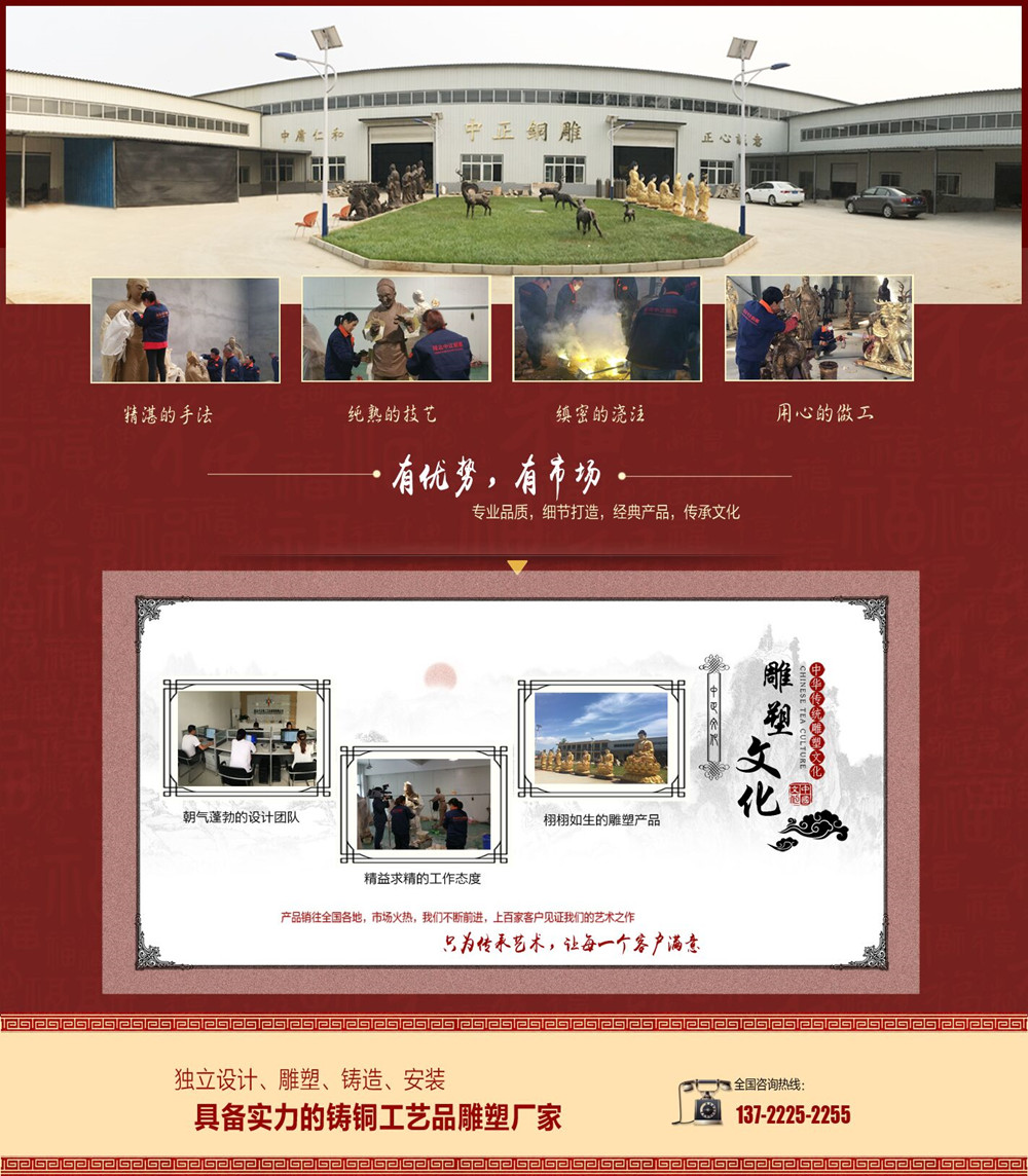 唐縣中正鑄銅雕塑制作生產廠家是一家具有獨立設計、雕塑、鑄造、制作施工能力的單位。擁有完善的,大型的,先進的生產設備,并由多位經驗豐富的高級鑄造技師指導生產及制作。公司主要鑄造人物雕塑、動物銅雕、城市雕塑、銅佛像、銅獅子、鑄銅鼎、銅鐘等銅工藝品,可按客戶提供銅雕圖片訂做加工,銅雕塑做工精美,質量有保證。